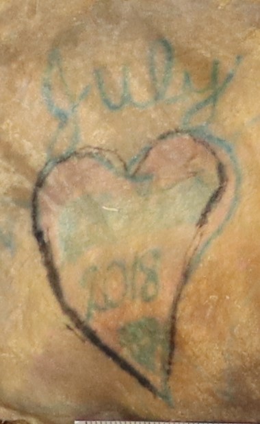 The lower leg has what appears to be a tattoo of a date "10-18-20.." the last two digits are not legible. On the individual's left thigh, there is a blue and black tattoo of a heart with '2018' inside and 'July' written in cursive above it.
